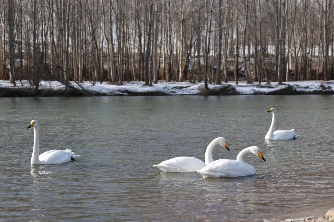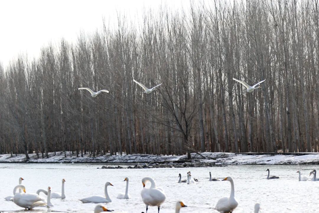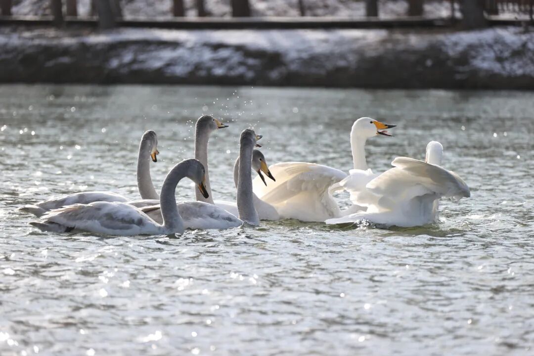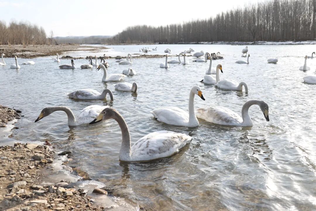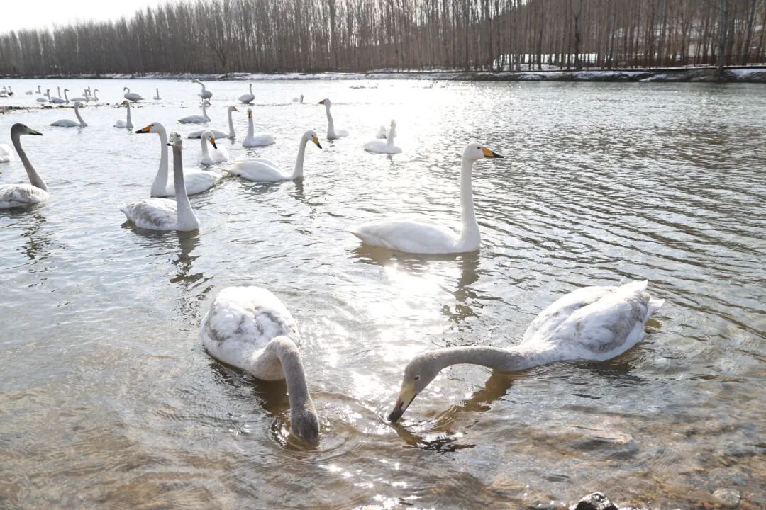 在红村天鹅湾景区,越冬白天鹅与人类和谐相处,成了冬天的一道靓丽风景。每年入冬,天鹅种群都会如约而至,从最初的十几只到如今的千余只,红村天鹅湾已然成为东北地区天鹅种群迁徙途中的“避风港”。